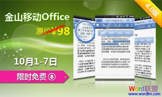 在国庆长假期间(2011年10月1日-7日),下载安装Kingsoft Office移动版办公软件4.0版的用户,联网输入邮箱即可免费升级至98元全功能正式版(无时间限制)。